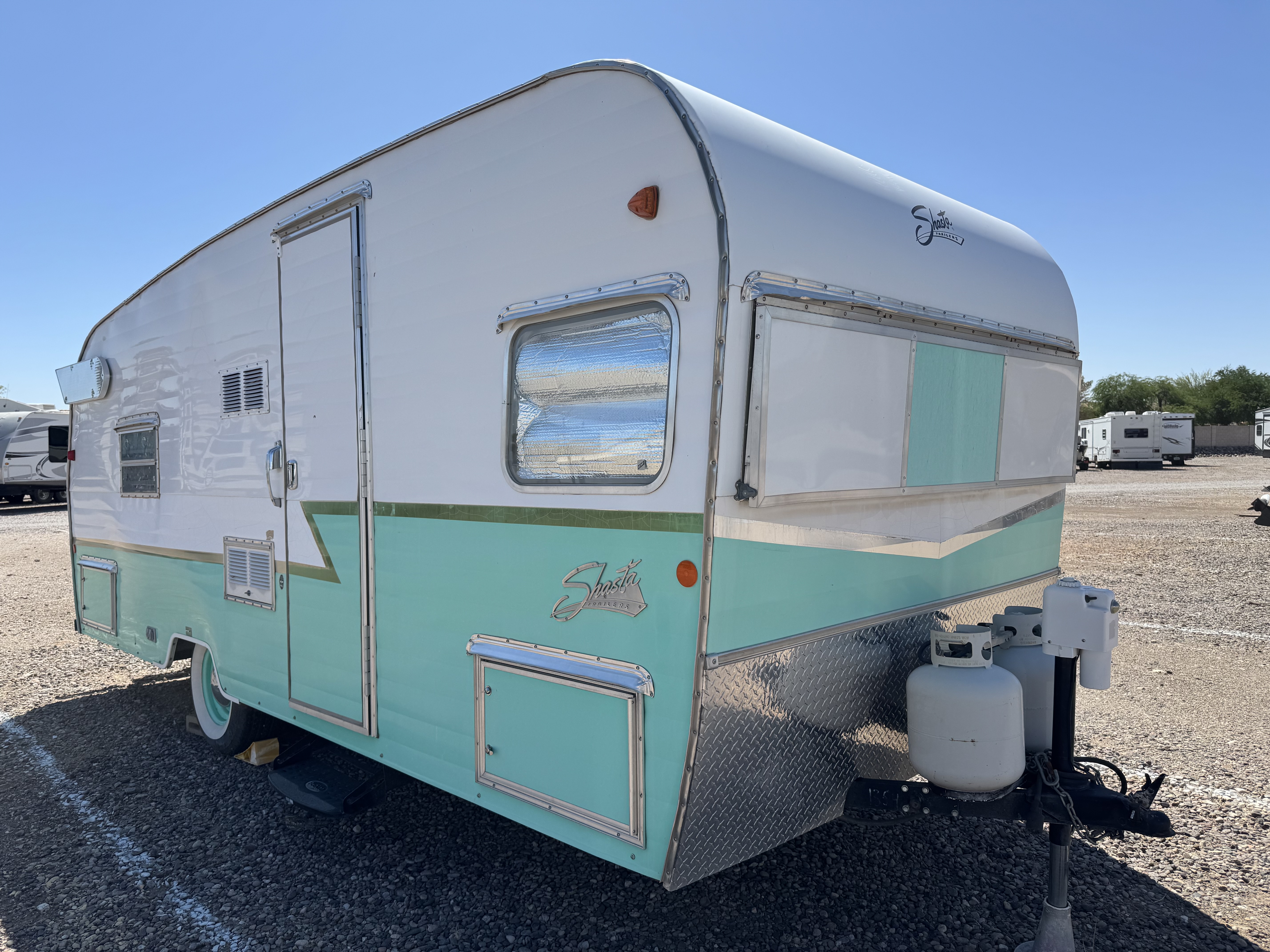 2015 Shasta Reissue of 1961 Airflyte 19 foot Seafoam Green - Factory upgrades done. Additional upgrades include: double propane tanks, electric tongue jack, diamond plate rock guard, window guard, Cocker WSW tires with baby moons, Spare wheel/tire, sewer hose tube, battery shut off switch, MaxXFan, upgraded thermostat, all cushions reupholster...Read More