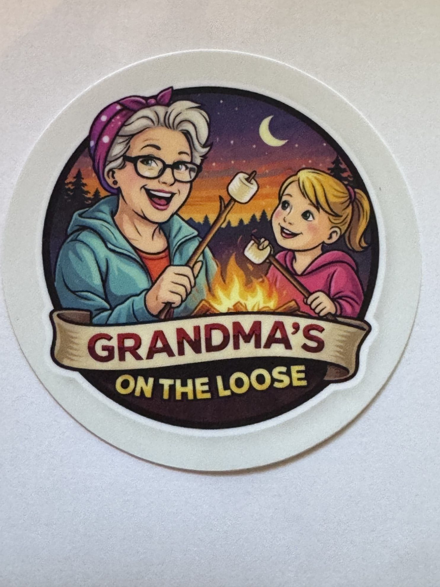 This “Grandma’s on the Loose” decal captures the sweetest kind of adventure—campfire nights, toasted marshmallows, and stories shared under the stars. Featuring a joyful grandma and her sidekick roasting s’mores, this design is all about laughter, connection, and a little mischief along the way.