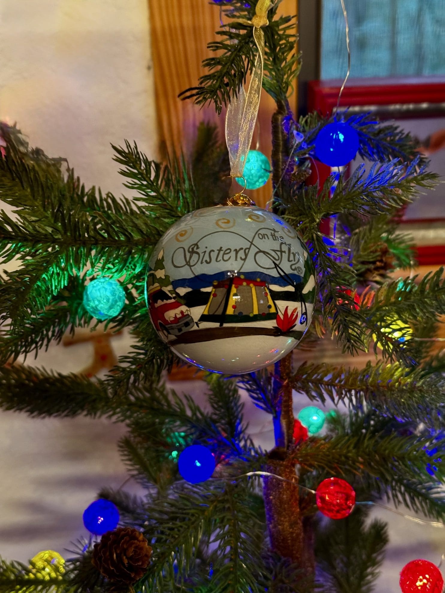 This ornament captures the heart of Sisters on the Fly—adventure, friendship, and gathering together under the open sky. Featuring the SOTF name with a cozy campsite scene, twinkling lights, and a welcoming campfire, the joy of shared journeys and unforgettable moments