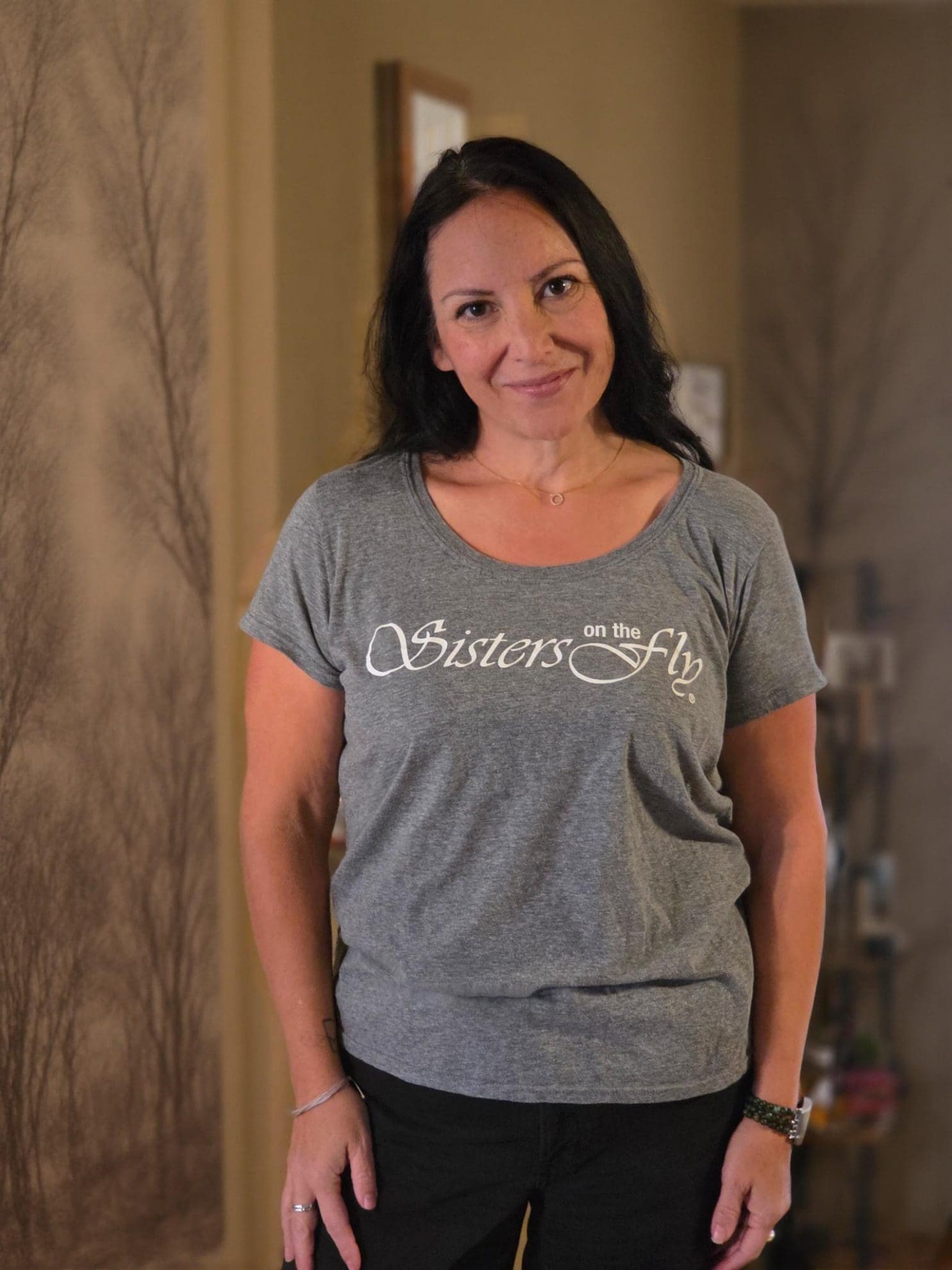 The model Tara, Sisters on the Fly, VP, and Website Manager. She’s wearing a large, true-to-size tee.